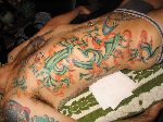 The photos show a couple of 'action shots' of Shannon doing the shading, and two views of the nearly-completed section. There is still a little bit more to do on this section, but I just couldn't sit still any more, even with the Bactine Trick helping. The total time was about two and a half hours.