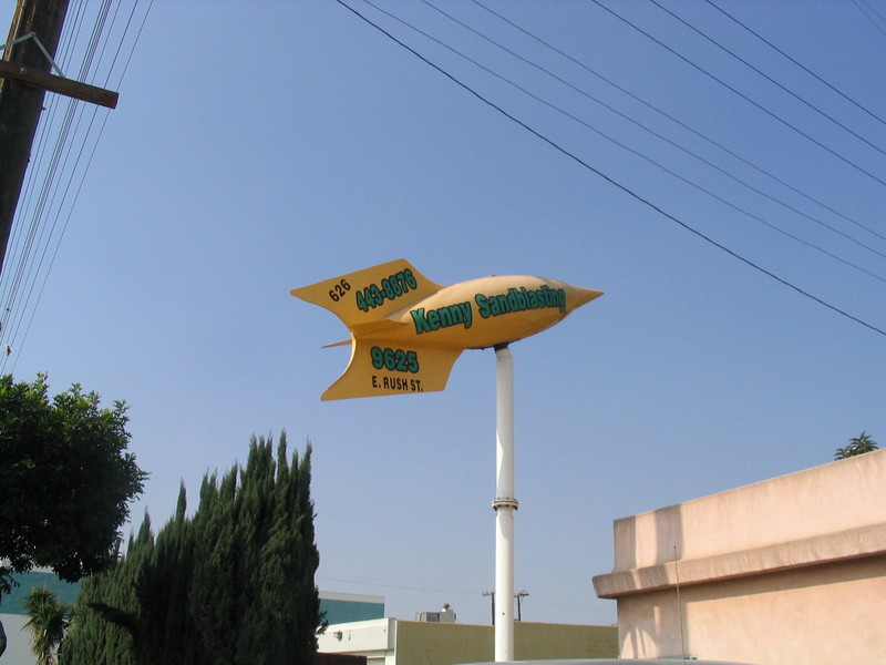 At the bottom, we took Beverly to Workman Mill. At Peck we took a left and took that up to Rush St. That was where we passed through the sheet-metal-shop ghetto and saw the rocket sign at Kenny’s Sandblasting. We also saw Mike’s Liquors and Bait Shop, which seemed a bit out of place given that Southern California is not usually renowned for its fishing opportunities.