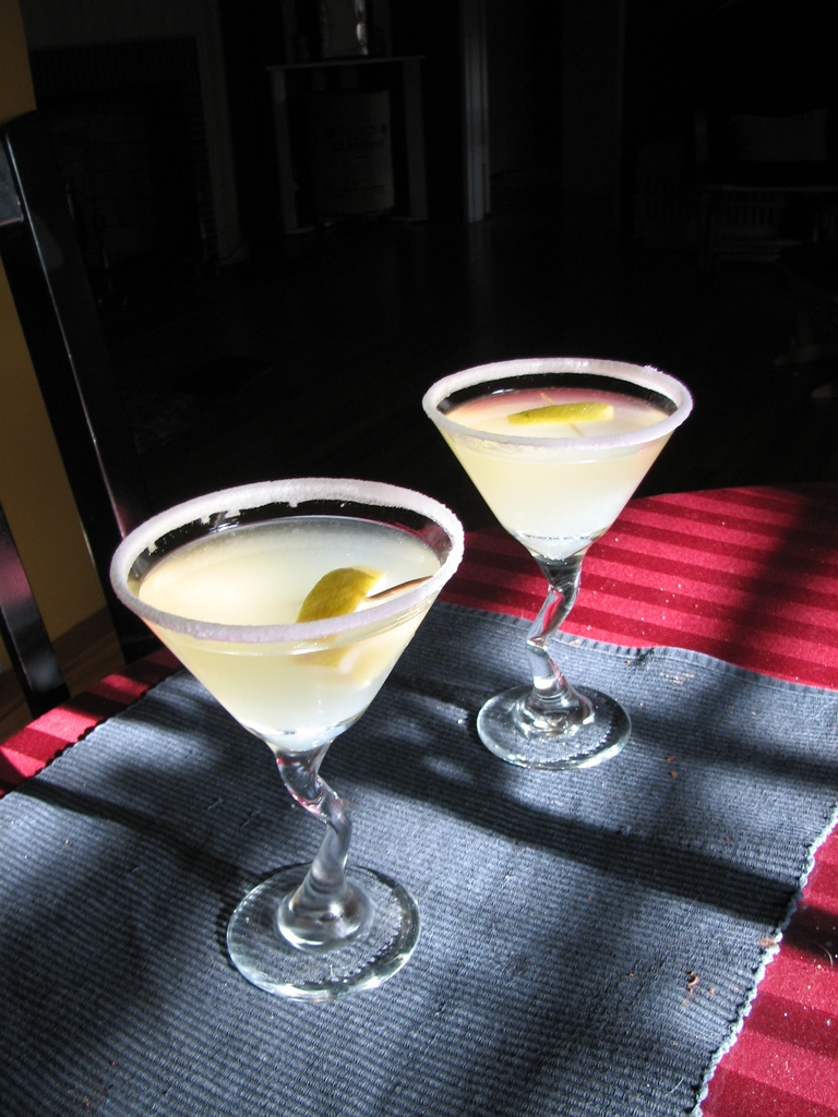 Well, it was really the day before, but that’s what we had to work with. So I made a nice dinner for Kathleen, complete with a Lemon Drop. New adventures in the kitchen. I’d never actually made anything like that before.