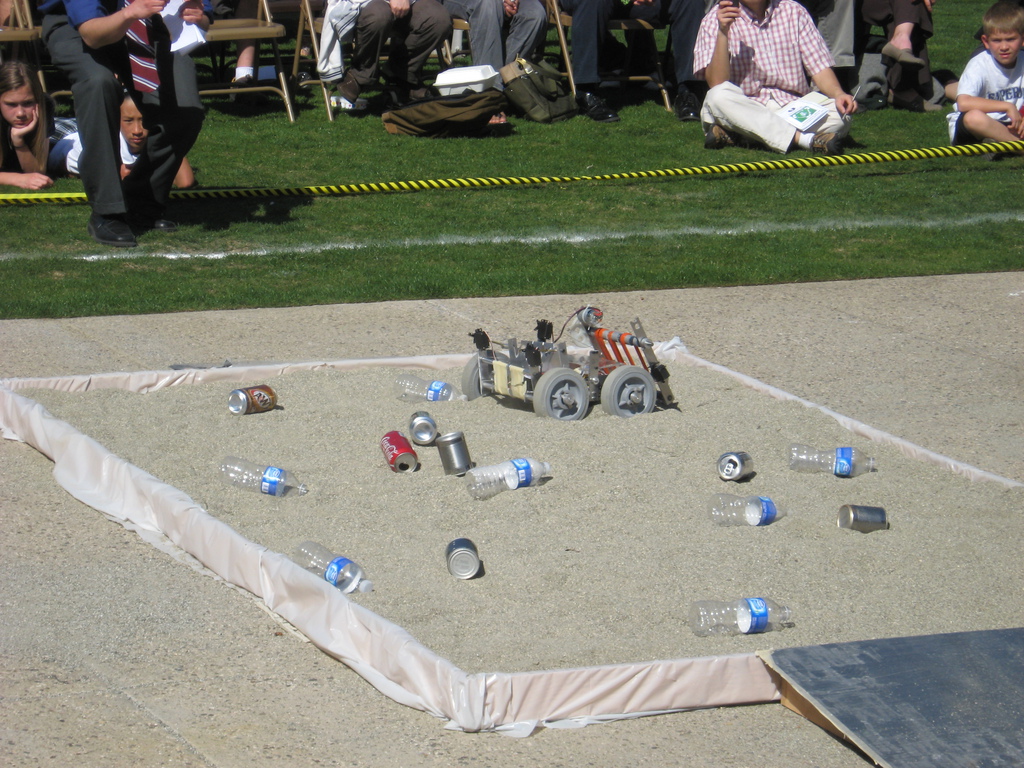 This year’s contest was to build machines to collect bottles and cans for recycling. The bottles and cans were spread around on the concrete, and they also had some on a set of ‘terrains’ for the machines to drive on. The terrains included a shipping pallet, some rocks, sand, and water. At the far end of the playing field, each team had three boxes for each of plastic, steel, and aluminum. They got points for getting the containers down to the boxes, more points for getting them in the boxes, and still more if they could do all that and get their machines back to the starting line before the end of each 5-minute match.