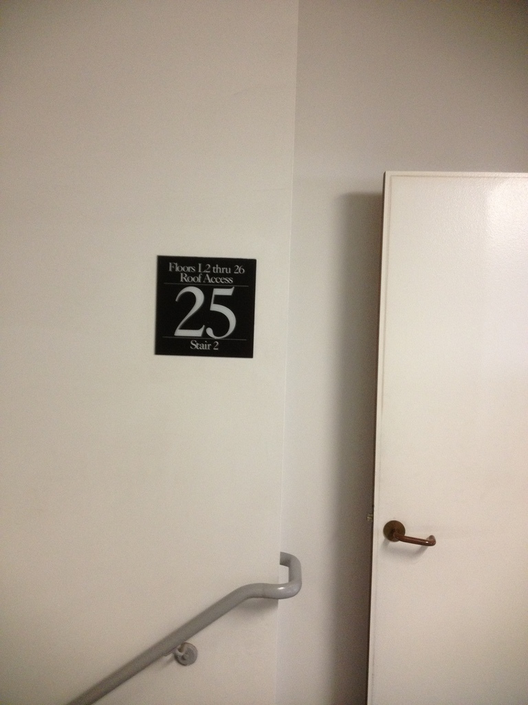 On the way back down, I had a look at my notes. It was 533 steps to the 25th floor, and 580 to the roof door. Almost all of it was flights of 11 steps with right turns. This was good, since it meant that the pattern I’d worked out last spring at the Aon building would work here. So when we got to the bottom, I stashed my notepad, put on my gloves, and we headed up again.