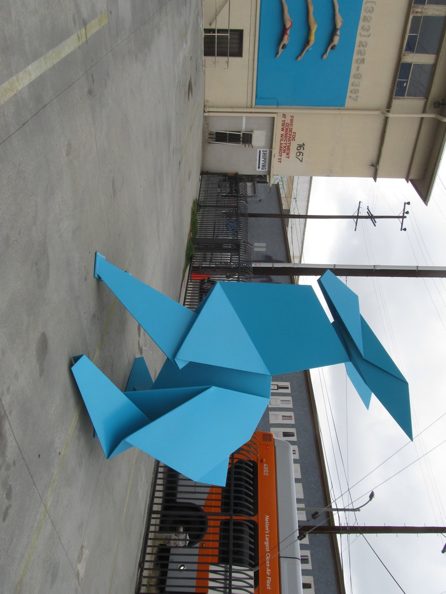 In Palmdale, we took in the view from the overlook by the freeway, and then climbed up the little hill so we could look down into the famous road cut where the 14 freeway crosses the fault. Then it was time for our lunch stop at Charlie Brown Farms. After that, it was time for Pallett Creek. We knew that the mysterious signs that marked where the fault crosses the road had been recently vandalized after more than a decade of marking the spot. So I’d made a new sign, which we brought along to use for the photo-op, even if it’s not properly planted in the ground. Then we traveled the quarter-mile or so to the actual trench site next to Pallett Creek. It’s not much to see, but it’s a chance to talk about how Kerry Sieh invented the science of paleoseismology there, back in the 1970s.