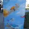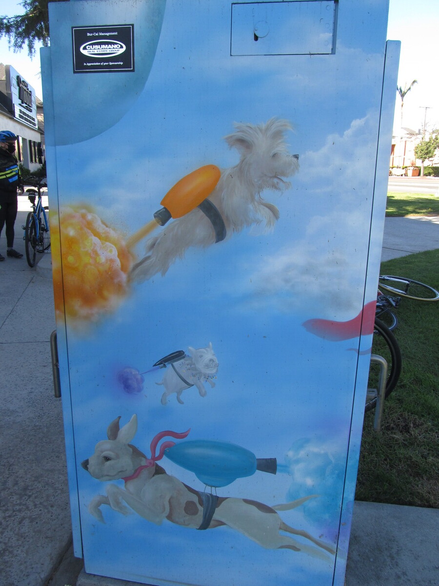 On the way out, we stopped briefly at South Hills Church to contribute some food items to their Little Free Pantry. When we got to Priscilla’s, all the tables were taken. As I said, it was a perfect day outside. So we went across the street and sat in the shade over there. That was the fist time I’d noticed the utility box there painted with the cute pictures of dogs with rockets strapped to their backs.