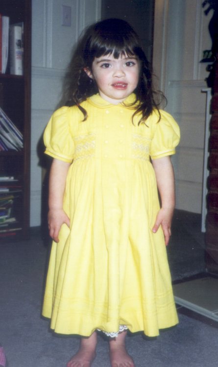 Wearing her yellow dress from Spain.