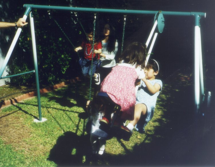 It's a good thing that Daddy anchored the legs of the swing set in concrete.
