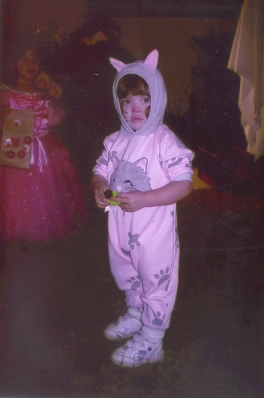 Wearing her Halloween costume at school.