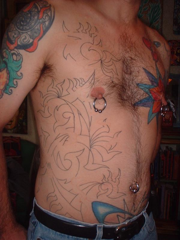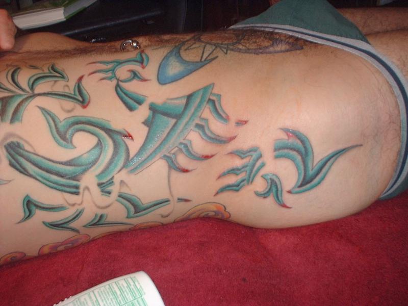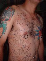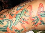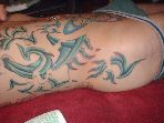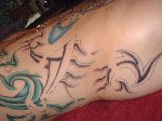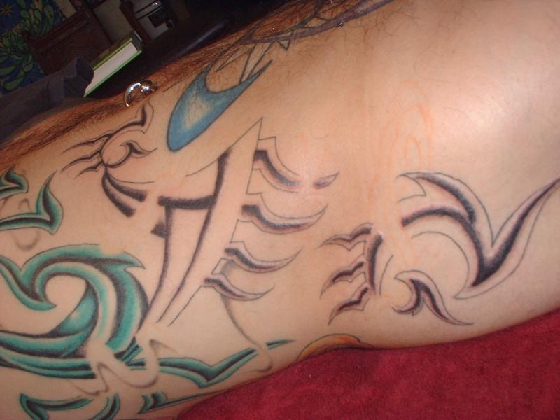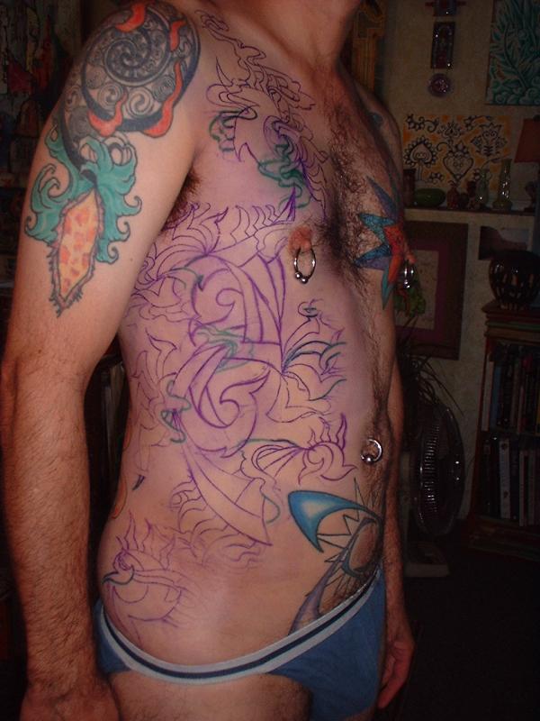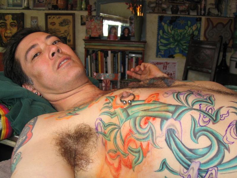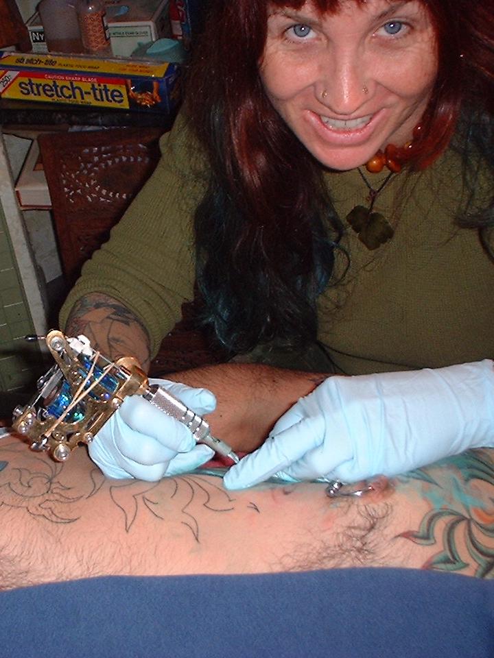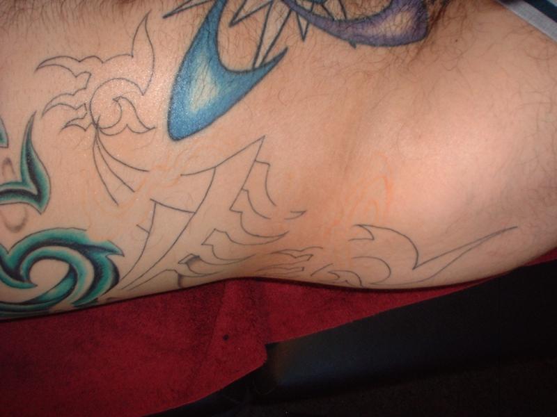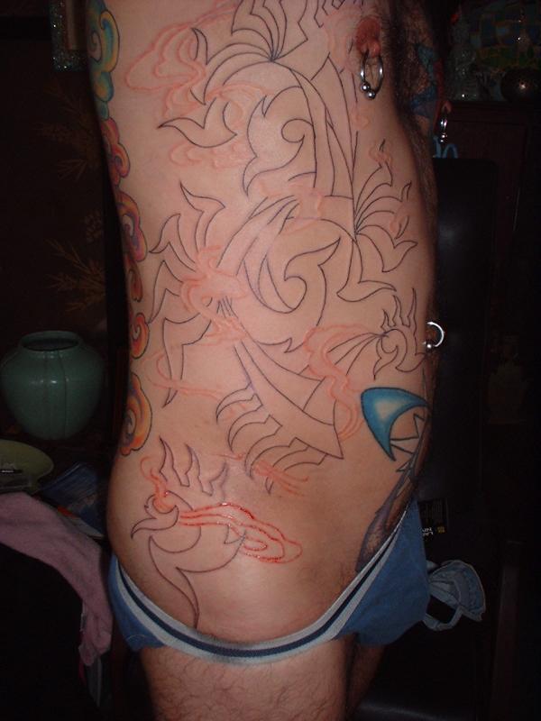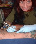The photos show a couple of 'action shots' of Shannon doing the shading, and two views of the nearly-completed section. There is still a little bit more to do on this section, but I just couldn't sit still any more, even with the Bactine Trick helping. The total time was about two and a half hours.