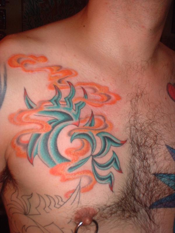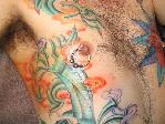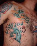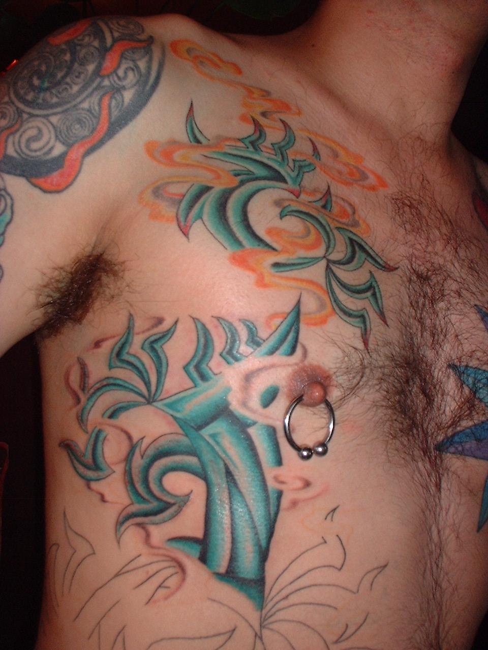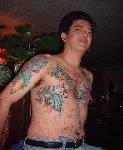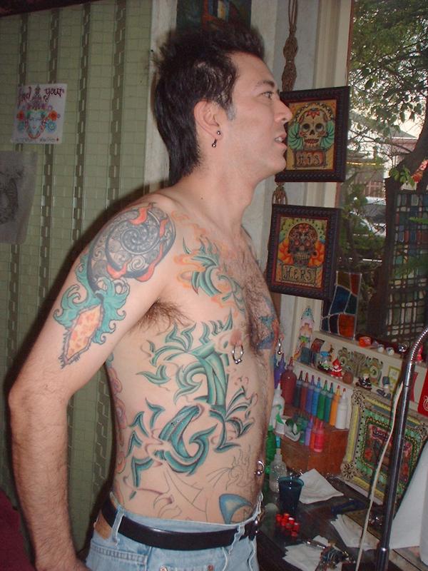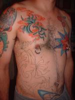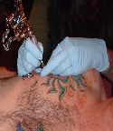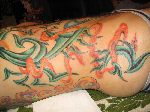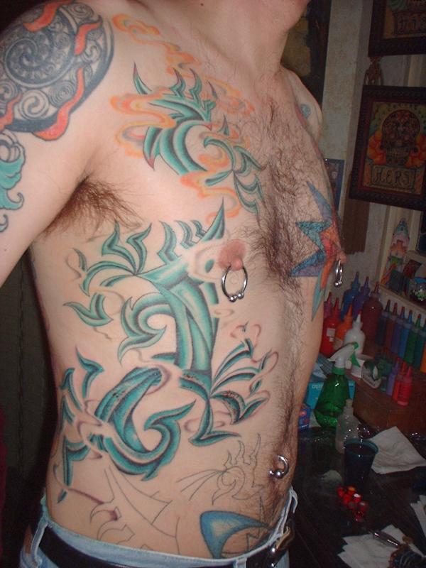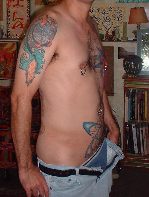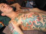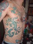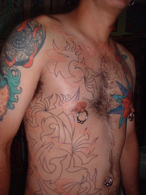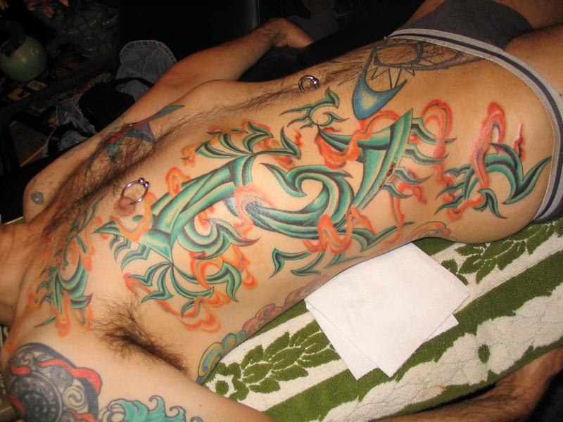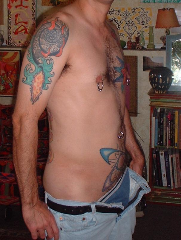 The photos show a couple of 'action shots' of Shannon doing the shading, and two views of the nearly-completed section. There is still a little bit more to do on this section, but I just couldn't sit still any more, even with the Bactine Trick helping. The total time was about two and a half hours.